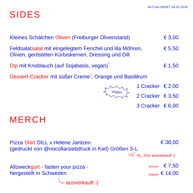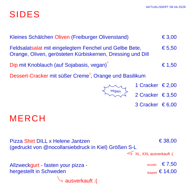 DILL (ehem. Pizza00) hat ein Zuhause bekommen. Seit September 2024 bieten wir an drei Tagen die Woche Platz für 15 bis 20 Pizzafans. Es gibt eine kleine und abwechslungsreiche Karte an Pizzen, Getränken und Dips.