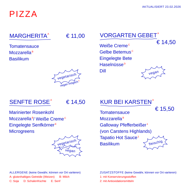 Es gibt vier verschiedene Pizzasorten, die wir alle paar Wochen verändern. Im Angebot sind immer vegane, vegetarische und fleischige Varianten, die nach Saisonalität und Verfügbarkeit zusammengestellt werden.