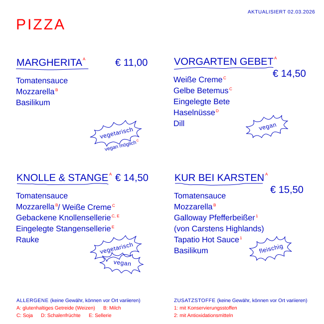 Es gibt vier verschiedene Pizzasorten, die wir alle paar Wochen verändern. Im Angebot sind immer vegane, vegetarische und fleischige Varianten, die nach Saisonalität und Verfügbarkeit zusammengestellt werden.