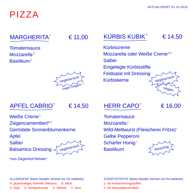 Öffnungszeiten: MI – FR 16:30 bis 22 Uhr (letzte Pizzarunde 21 Uhr) | Am 03.10.2025 (Freitag) geschlossen.